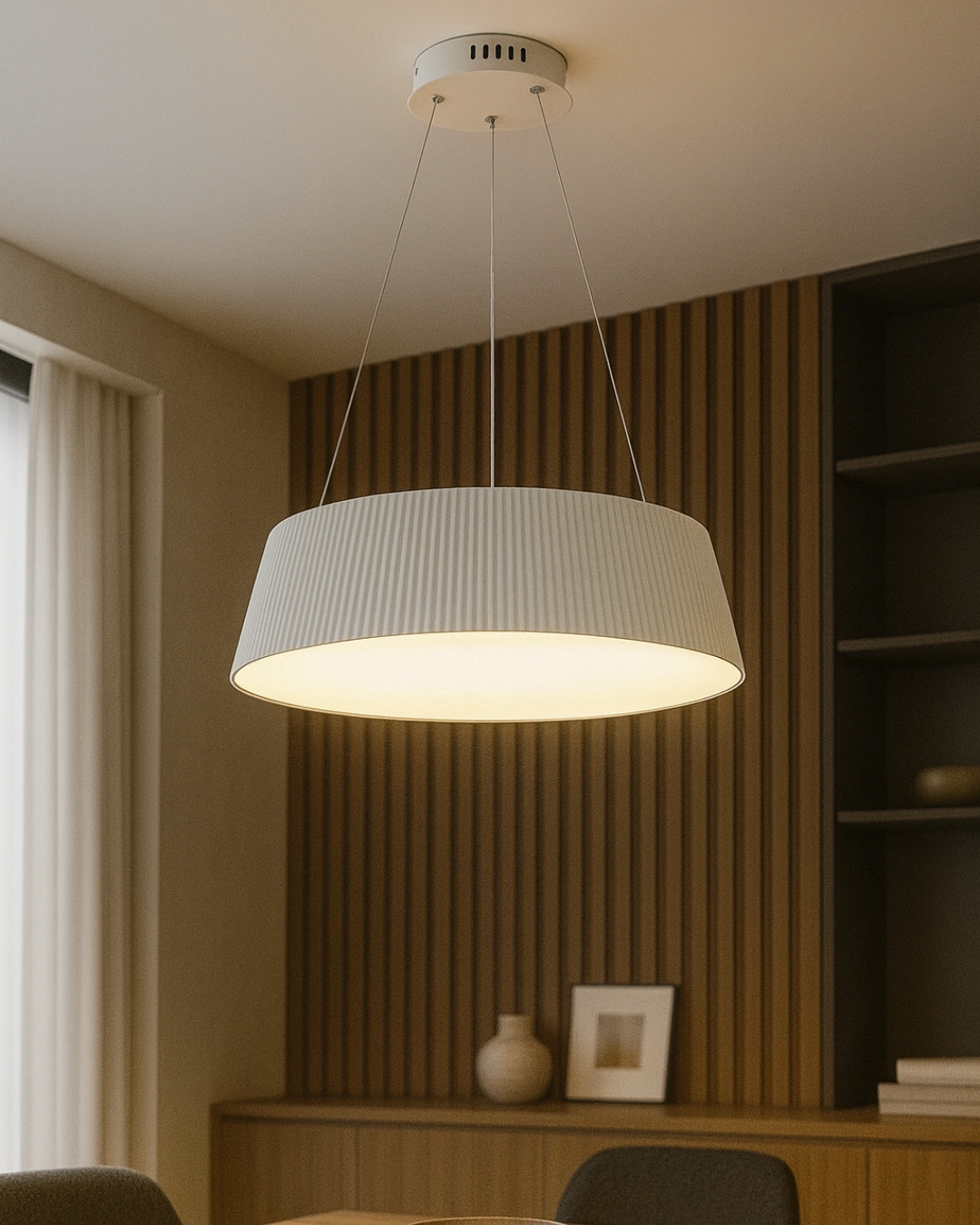 Orivelle Beam Threads is designed for impact and sophistication. With its wide, drum-shaped design and vertical ribbed detailing, Orivelle is both commanding and elegant. It spreads light evenly, making it ideal for large, statement spaces.